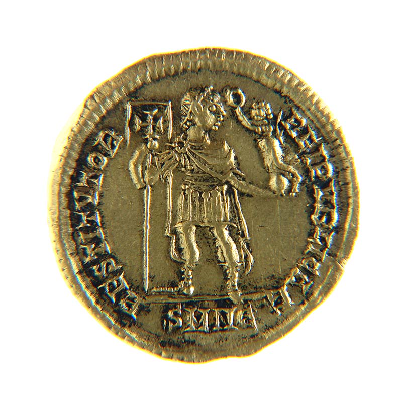 Imperatore stante a destra con labaro e vittoria; RESTITVTOR REIPVBLICAE, in esergo SMNE