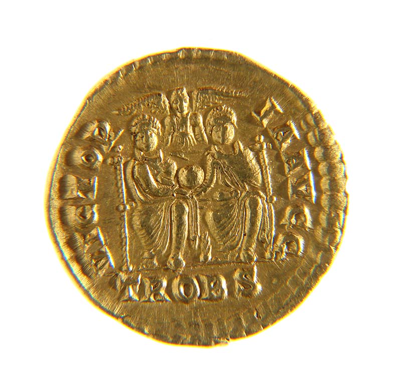 Graziano e Valentiniano assisi; VICTOR IAAVGG, in esergo TROBS
