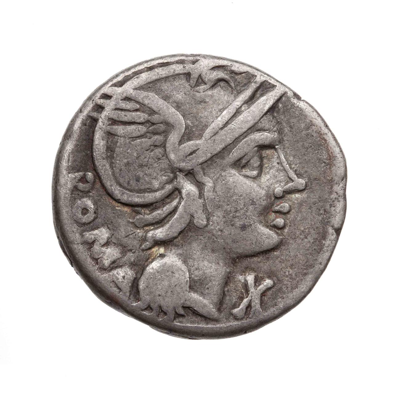 Testa elmata di Roma a destra. Dietro: ROMA; davanti: segno di valore X.;