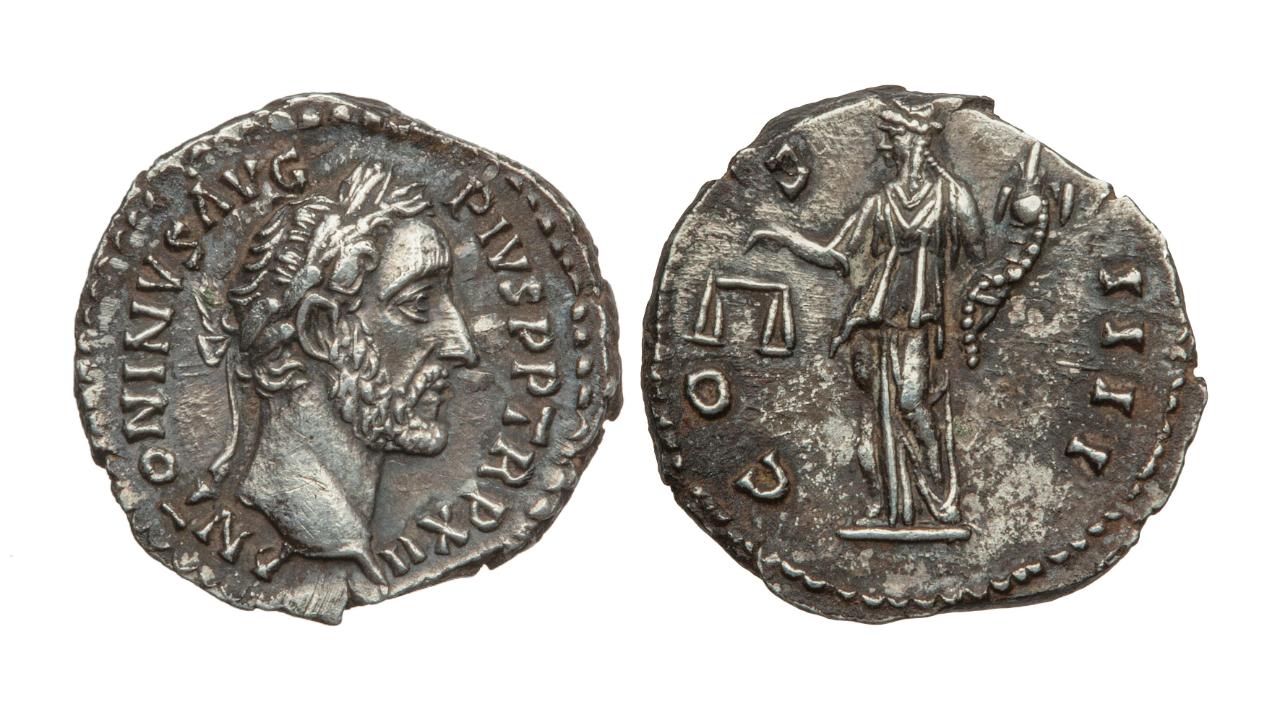 Denario con testa di Antonino Pio / Personificazione della Giustizia