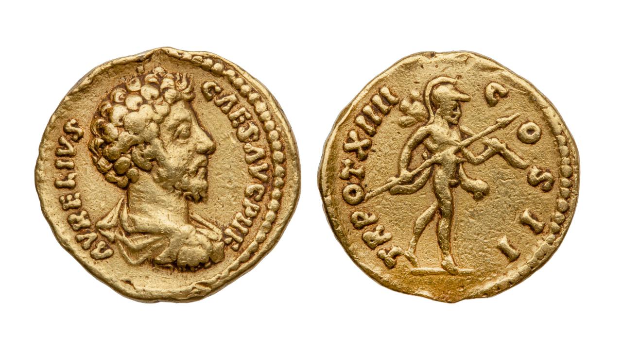 Busto dell’imperatore di profilo, rivolto a destra, senza corona ma con capelli e barba ricci; le spalle sono coperte dalla toga.; AURELIUS CAES AUG PII F (Aurelio Cesare, figlio dell’Augusto Pio)