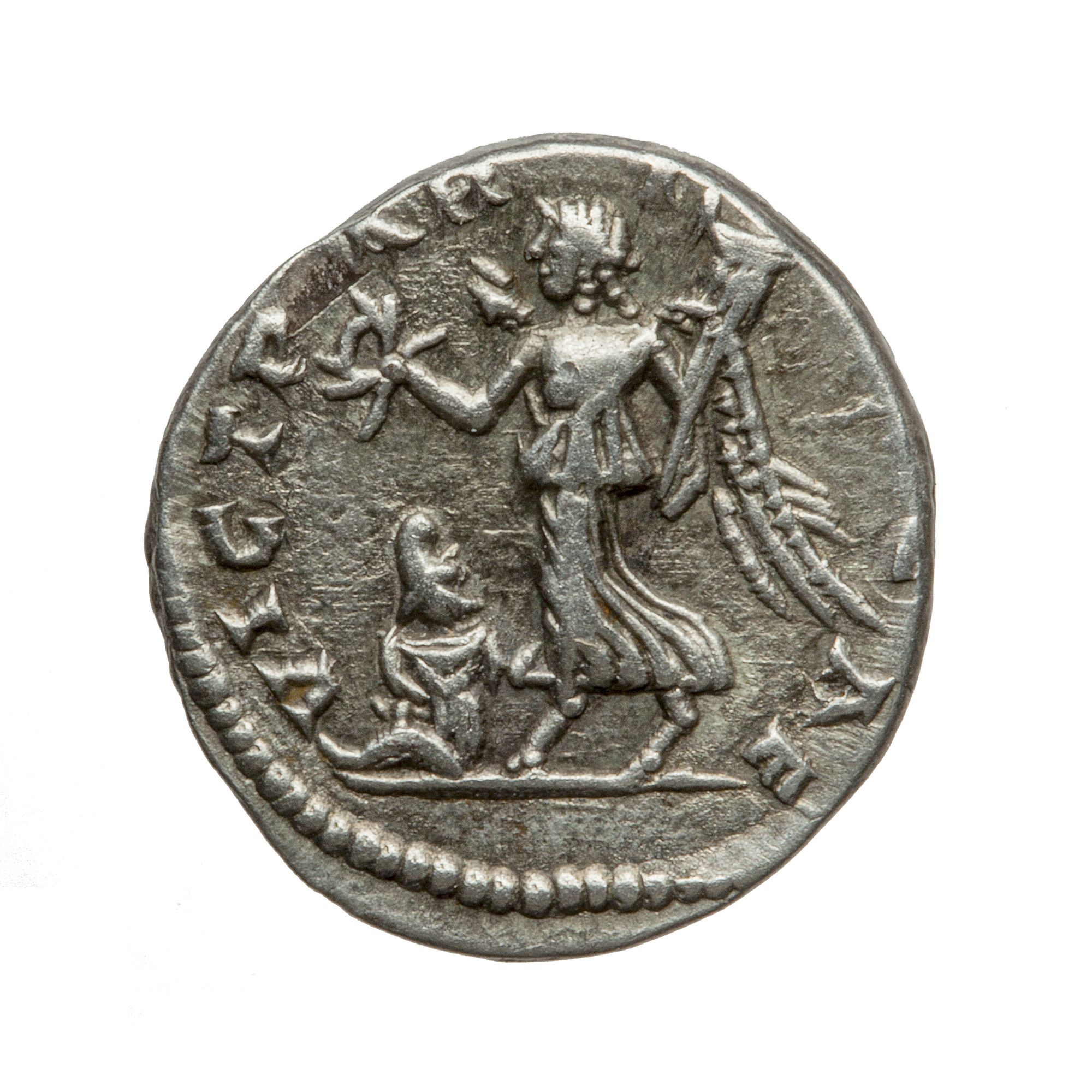 Denario con testa di Settimio Severo / Vittoria e prigioniero partico