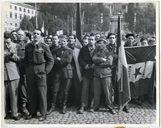 I PATRIOTI DELLA DIVISIONE "GARIBALDI" CHE HANNO COMBATTUTO AGLI ORDINI DEL MARESCIALLO TITO, SFILANO A TRIESTE IL 20 MAGGIO 1945, AL LORO RITORNO IN JUGOSLAVIA