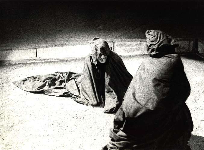 La morte di Danton, dramma di George Büchner. Struttura di pali con al centro due statue di figure umane di cui una alata