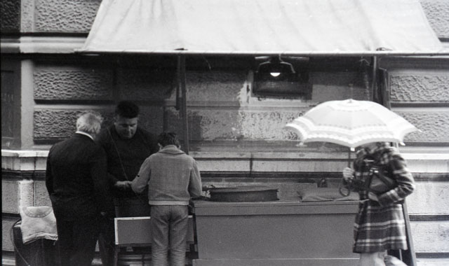 Venditore di caldarroste in viale e segnali di sosta incappucciati