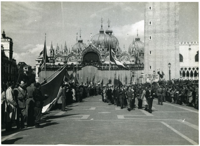 Cerimonia partigiani in Piazza S. Marco, di fronte alle autorità angloamericane