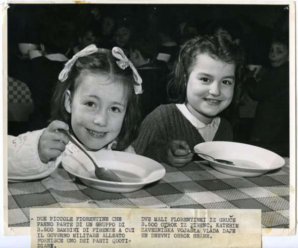 DUE PICCOLE FIORENTINE CHE FANNO PARTE DI UN GRUPPO DI BAMBINI DI FIRENZE A CUI IL GOVERNO MILITARE ALLEATO FORNISCE UNO DEI PASTI QUOTIDIANI.