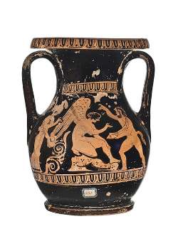 Pelike attica a figure rosse. Lato A: Eros, satiro e donna; Lato B: due giovani ammantati