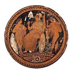 Phiale apula a figure rosse. Interno: Eros. Esterno: donna seduta