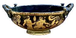 Skyphos pisside apulo a figure rosse, Lato A: satiro davanti a cippo con uovo; Lato B: testa femminile.
