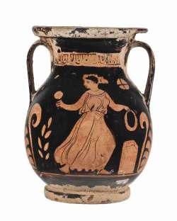 Pelike pestana a figure rosse. Lato A: donna andante e ara. Lato B: efebo con torcia e patera