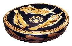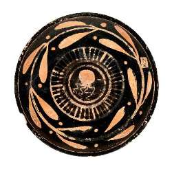 Patera apula sovraddipinta a fasce tra viticci e palmetta.