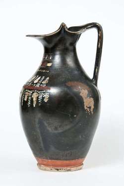Oinochoe a vernice nera tendente al rosso sovraddipinta