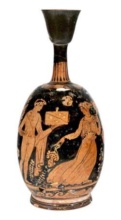 Lekythos apula a figure rosse con scena di corteggiamento.