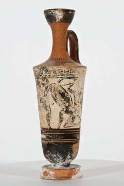 Lekythos attica a figure rosse con palmetta ad antefissa.