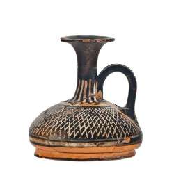 Lekythos a profilo schiacciato a vernice nera sovraddipinta a reticolo