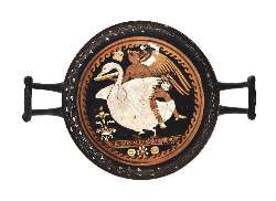 Kylix apula a figure rosse. Interno: Eros su cigno. Lato A: Eros seduto con offerte. Lato B: donna in corsa.