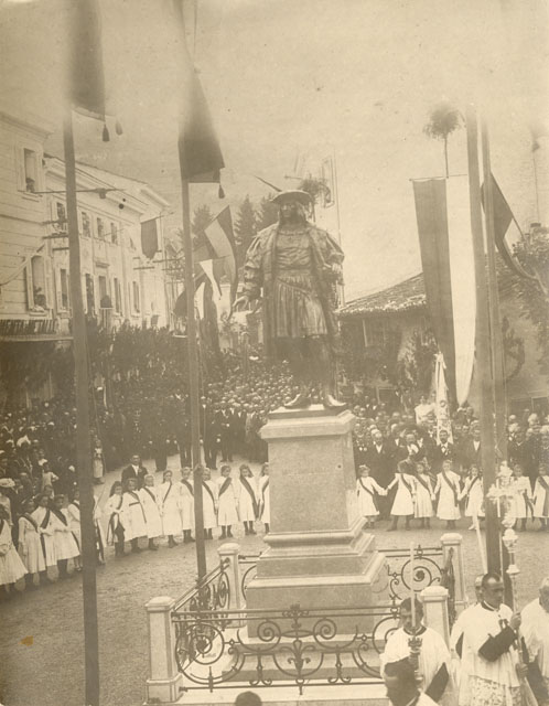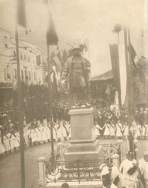 Cormons, riproduzione da fotografia dello scoprimento del monumento di Massimiliano 1. d'Asburgo il 14.06.1902