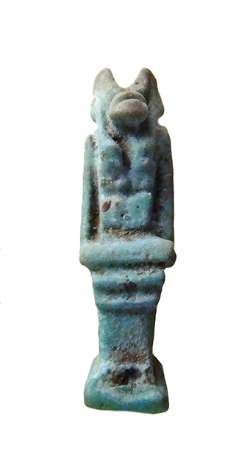 Amuleto in faiance raffiguranre Anubi con davanti pilastro ged, dall'Egitto