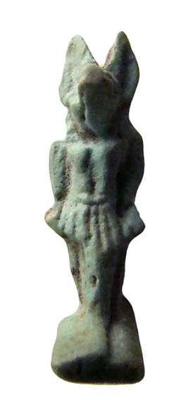 Amuleto in faiance raffigurante Anubi con pilastro dorsale forato, dall'Egitto