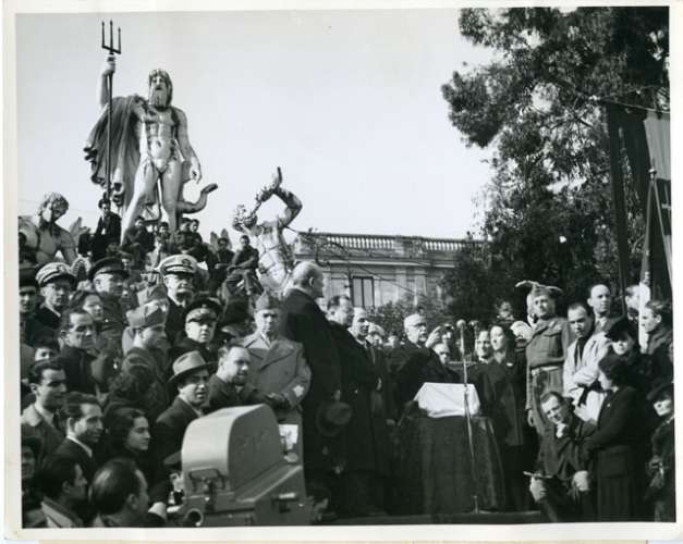 Il principe Umberto II di Savoia presiede la parata del nuovo esercito con i ministri Ivanoe Bonomi, Alessandro Casati, Umberto Tupini, il senatore Carlo Sforza