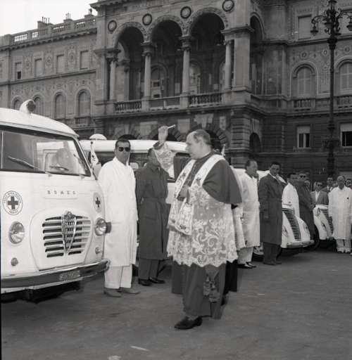 Benedizione automezzi CRI piazza Unità e tendone CRI piazza Malta ; Signora Gaiardo (trattoria via Ginnastica)