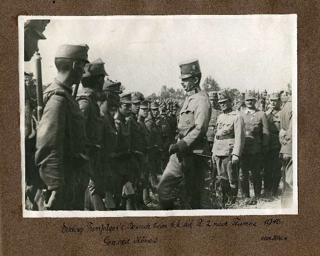 Erzhzg. Tronfolger's Besuch beim k.k. Sch. R. 2. nach Tlumac 1916 Gen. Obst. Kövess Oblt. Klein