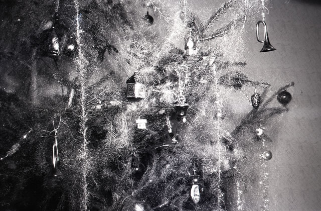 Ritratto di bambina accanto all'albero di Natale