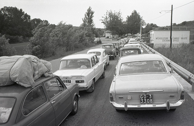Lunga fila di turisti a Pese (confine con la Jugoslavia)