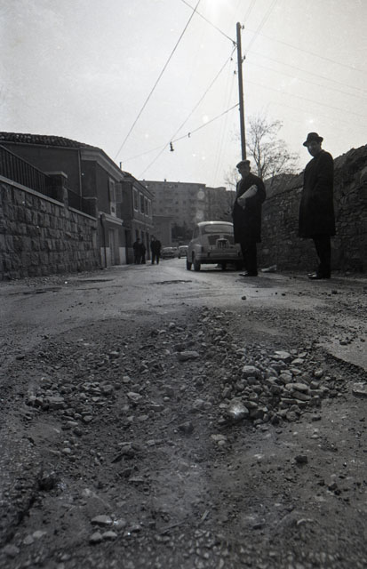 2 costruzioni (Carso?) ; traffico auto, moto, pedoni strada per Sistiana