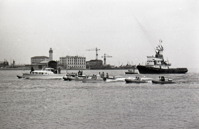 Coppia su panchina molo Audace ; arrivo raid gommoni