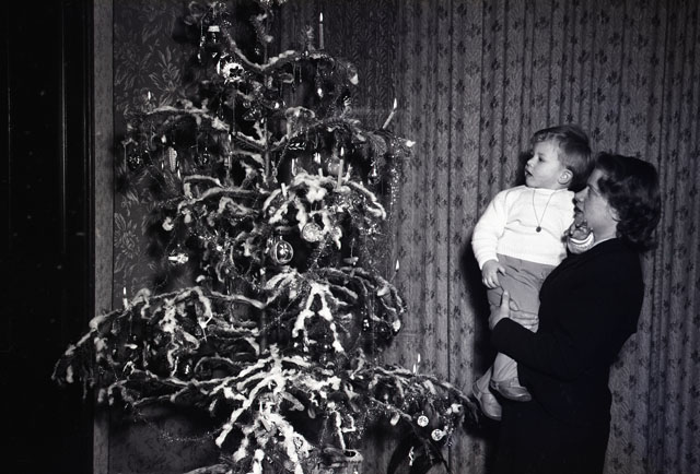 Ritratto di bambina accanto all'albero di Natale e al presepio