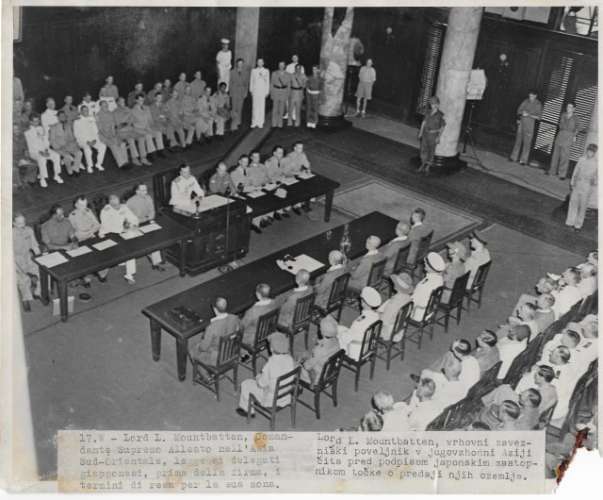 Lord Louis Mountbatten reading the surrender terms to the Japanese before they sign