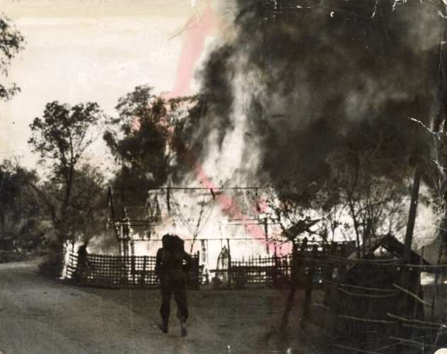 Accused of aiding nipponese. Chinese soldiers untrusses a suspected, japanese spy at a division headquarters, Salween river sector, china (...)