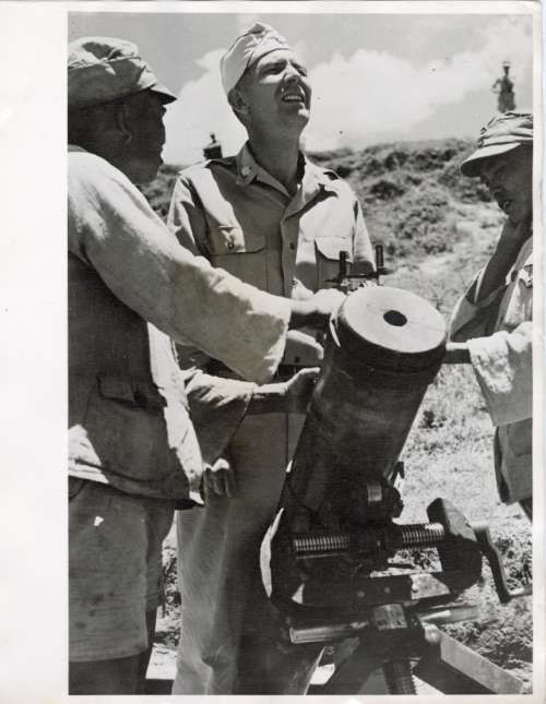 Cina : un ufficiale americano istruisce i soldati cinesi nell'impiego di un mortaio fornito dagli Stati Uniti per le operazioni contro i giapponesi