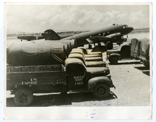 Allied trucks await bomb-laden transports from India at a U.S. Army Air base in China