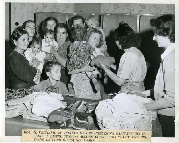 1002. IL VESTIARIO FU DONATO DA ORGANIZZAZIONI CARITATEVOLI ITALIANE, E DISTRIBUITO DA ALCUNE DONNE VOLONTARIE CHE PRESTANO LA LORO OPERA NEL CAMPO.