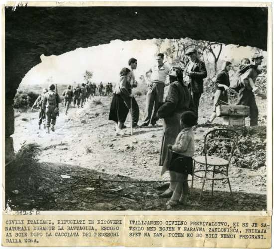 CIVILI ITALIANI, RIFUGIATI IN RICOVERI NATURALI DURANTE LA BATTAGLIA, ESCONO AL SOLE DOPO LA CACCIATA DEI TEDESCHI DALLA ZONA.