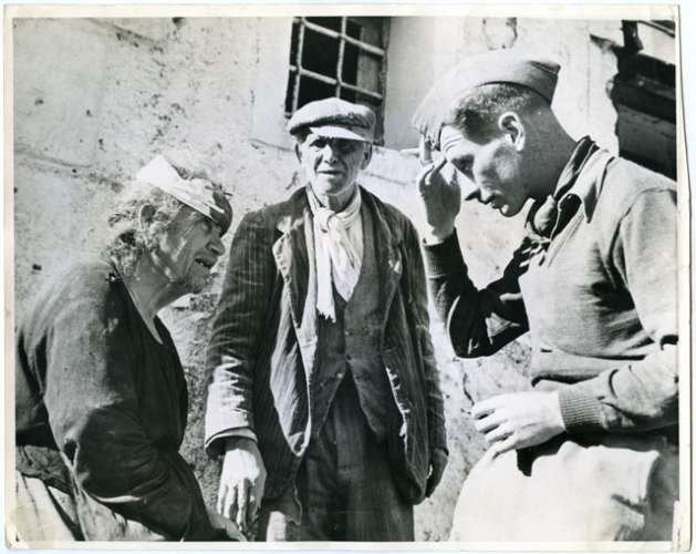 CIVILIAN GAVES HER VERSION OF THE WAR SGT. A.W. ACLAND OF THE BRITISH FORCES TAKE TO AN OLD WOMAN WOUDED BYSHRAPTEL IN PRATELLA, ITALY.