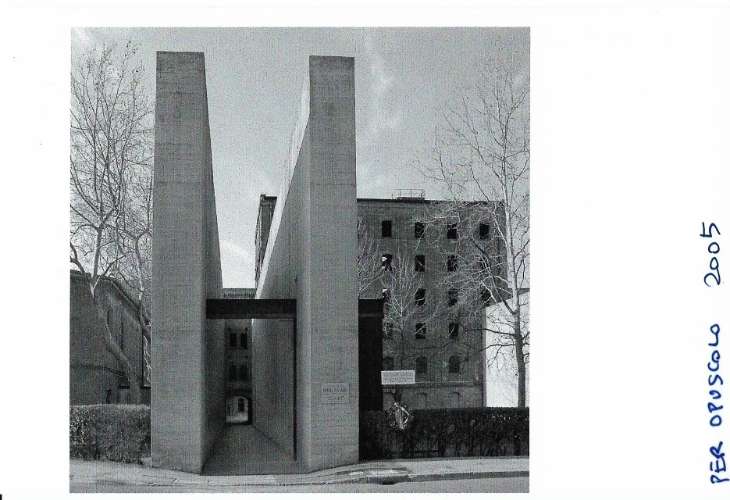 Riproduzione fotografica della facciata di un edificio all'interno della Risiera di San Sabba