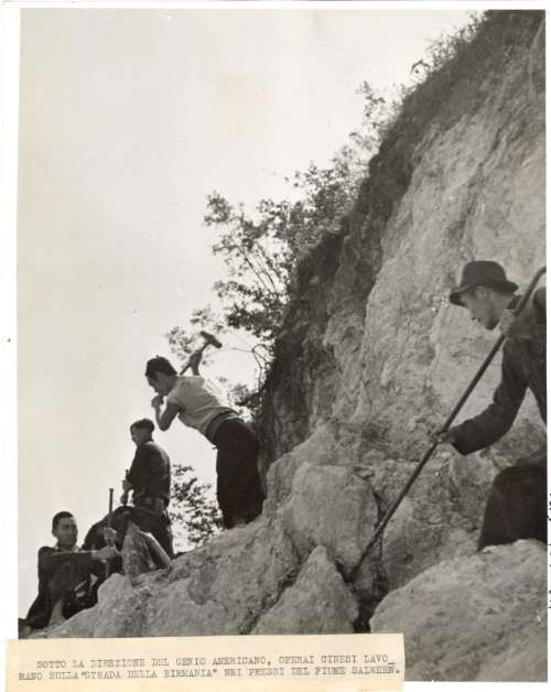 Sotto la direzione del genio americano, operai cinesi lavorano sulla strada della Birmania