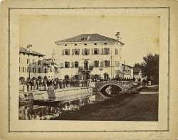 Aquileia. Stalla Moschettini (demolita) con lapidi e sculture romane sulle facciate