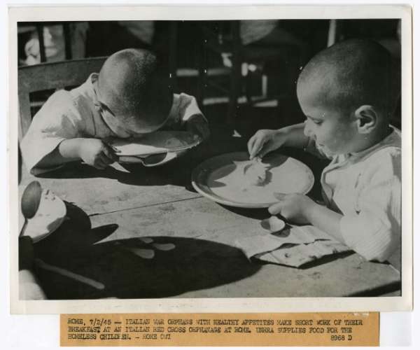 ITALIAN WAR ORPHANS WITH HEALTHY APPETITES MAKE SHORT WORK OF THEIR BREAKFAST AT AN ITALIAN RED CROSS ORPHANAGE AT ROME. UNRRA SUPPLIES FOOD FOR THE HOMELESS CHILDREN