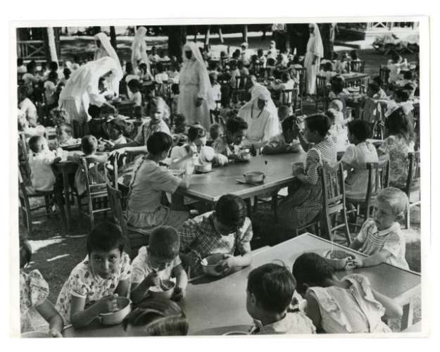 BREAKFAST TIME FOR WAR ORPHANS - ITALIAN CHILDREN WHO LOST THEIR PARENTS IN BATTLETORN TOWNS SUCH A CASSINO, ANZIO, VELLETRI AND OTHERS ARE BEING CARED FOR AT AN ITALIAN RED CROSS ORPHANAGE ON MONTE MARIO, ROME