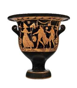 Cratere a campana apulo a figure rosse. Lato A: corteo bacchico; Lato B: tre giovani ammantatitiAti
