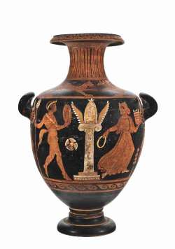 Hydria campana a figure rosse con scena dionisiaca attorno ad un monumento funerario