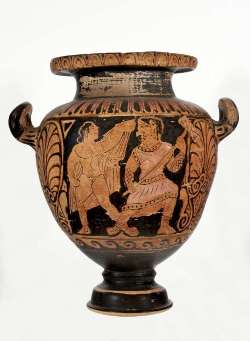 Stamnos a figure rosse etrusco. Lato A: defunta portata negli Inferi dal demone della morte, Charun. Lato B: Grifone attacca guerriero disteso a terra