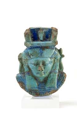 Parte superiore del manico di un sistro in faience con il volto della dea Hathor, dall'Egitto