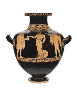 Hydria campana a figure rosse con fanciulle attorno un'ara, disposte su due livelli