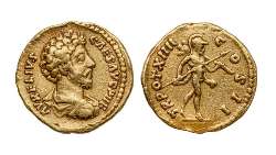Aureo con testa di Traiano / Trofeo d'armi tra due prigionieri